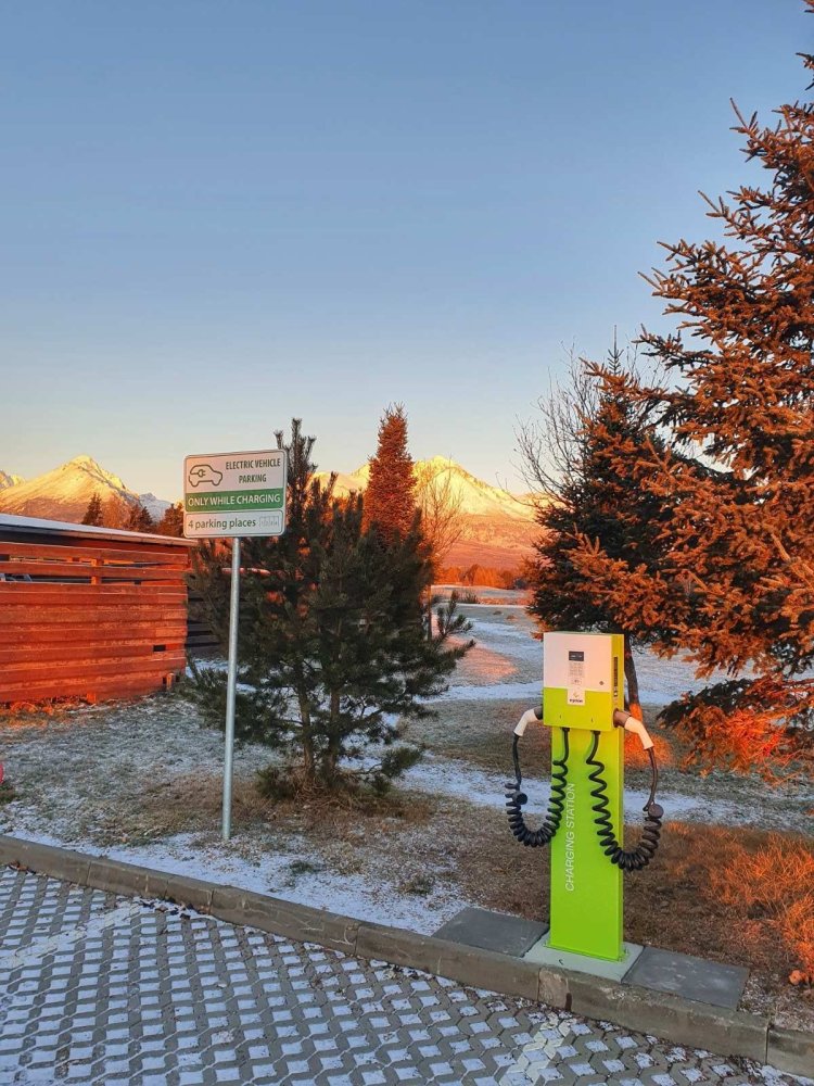 Popis: AC stanica s dvomi konektormi- Plug Type 2 s výkonom až do 22 kW pred Hotelom International vo Veľkej Lomnici